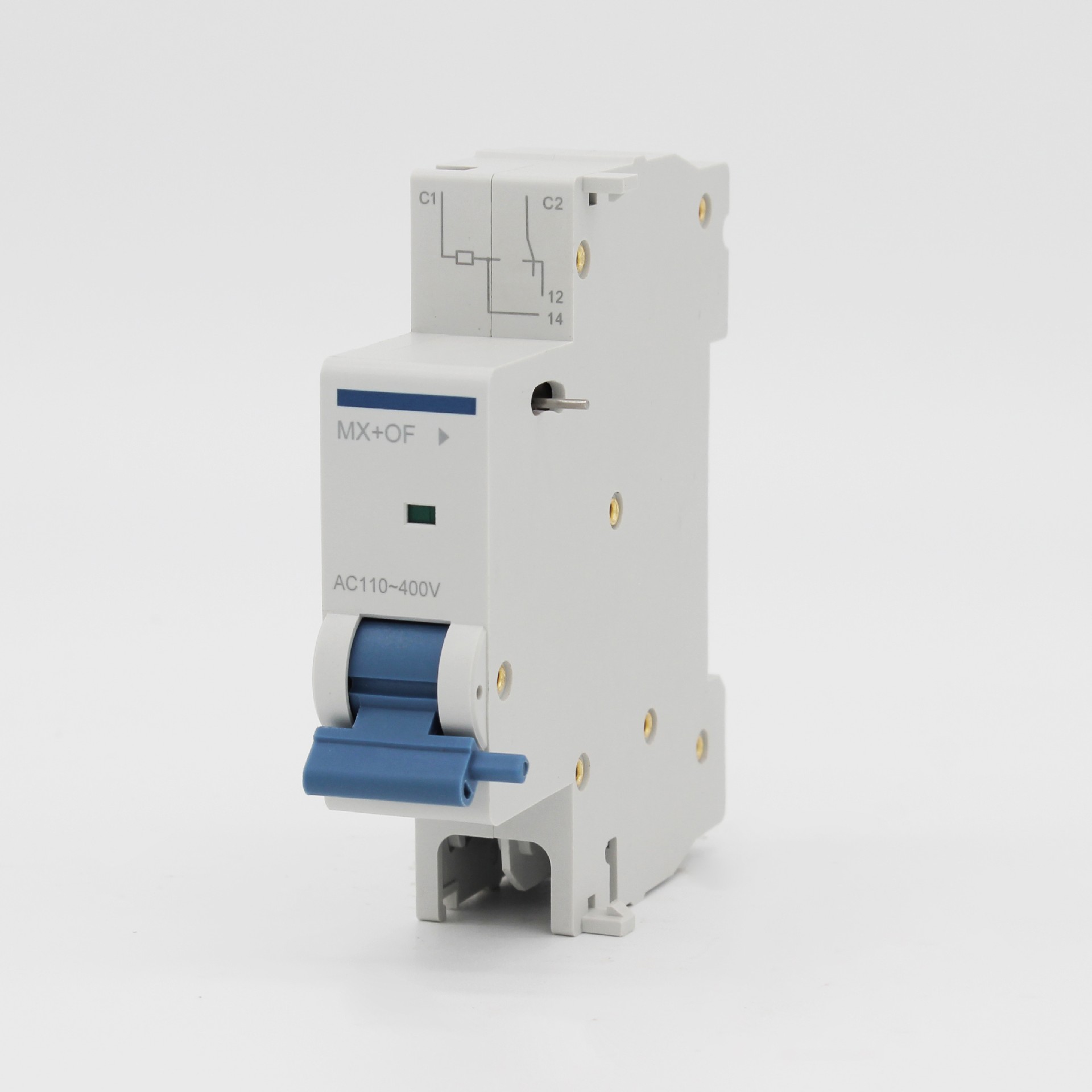 在額定控制電源電壓值的 70%~110%,脫扣器均應可靠動作使斷路器斷開。當脫扣器分閘時,C2、12 端子接通,外接安全信號燈亮;當脫扣器合閘時,C2、14 端子接通,外接警告信號燈亮;當脫扣器合閘后,外接按鈕接通時,脫扣器的機構脫扣并帶動斷路器脫扣分斷。